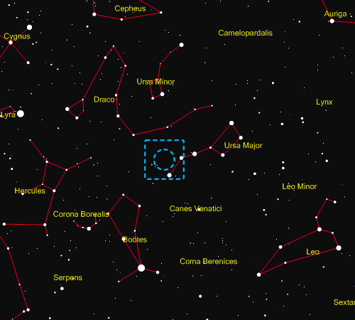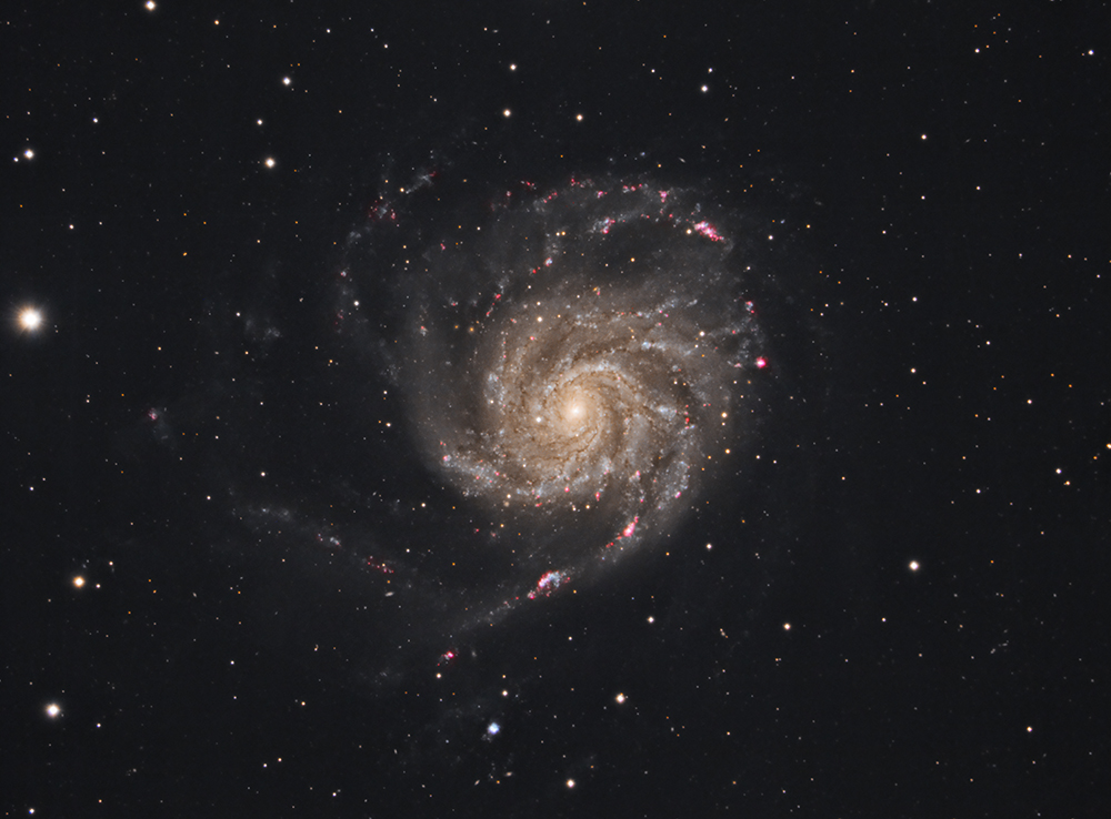 Pierre Méchain, the discoverer of M101, described it as ‘a nebula without star, very obscure and pretty large’. The Pinwheel Galaxy is a huge, relatively nearby, face-on spiral galaxy in the constellation of Ursa Major. It is remarkably asymmetric, with its core considerably displaced from the centre of its disk. This and its prominent spiral arms are due to the tidal forces from interactions with its companion galaxies. There are many pinky-red Hα rich star forming regions throughout the galaxy, ionized by the hot, bright, young stars within them. They are capable of creating hot superbubbles, cavities hundreds of light years across blown by stellar winds.