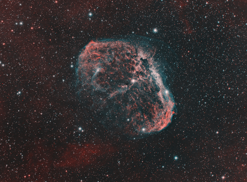 This image uses narrowband filters to separate the hydrogen alpha light (Hα) and the doubly ionised oxygen light (OIII) to reveal the intricate detail of the nebula. The Hα is visible as the red coloured structures, while the OIII shows as the green-blue coloured outer shell of the nebula.