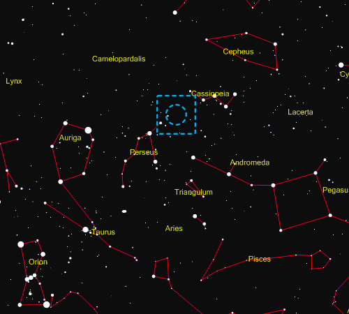 Perseus and The Double Cluster are circumpolar, meaning that, from our latitude, they are visible all year round, though best observed in winter when high in the sky. It is possible to make out the bright patch of sky with the naked eye, but when viewed through binoculars or a telescope, the area comes to life as a swarm of stars.
