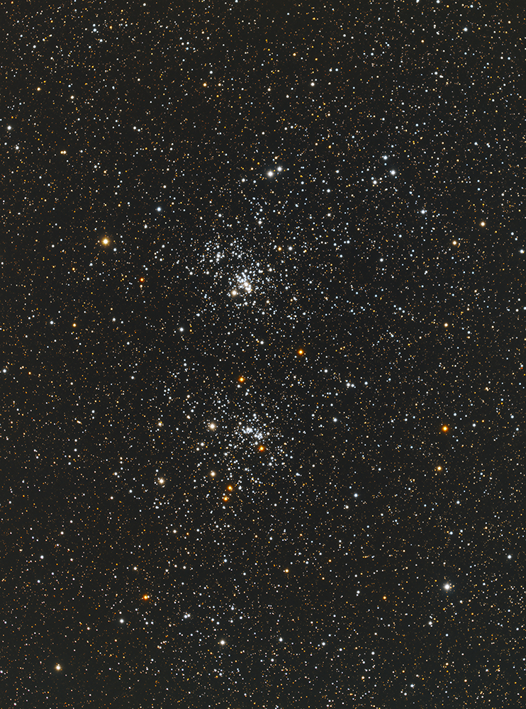 Although the object in this area of sky was catalogued by Hipparchus, the Greek astronomer, as ‘a patch of light in Perseus’ as early as 130BC, the clusters are only about 200 light years apart, so were only separated into two distinct objects in the early 19th century by William Herschel. For some unknown reason Charles Messier did not catalogue this object.