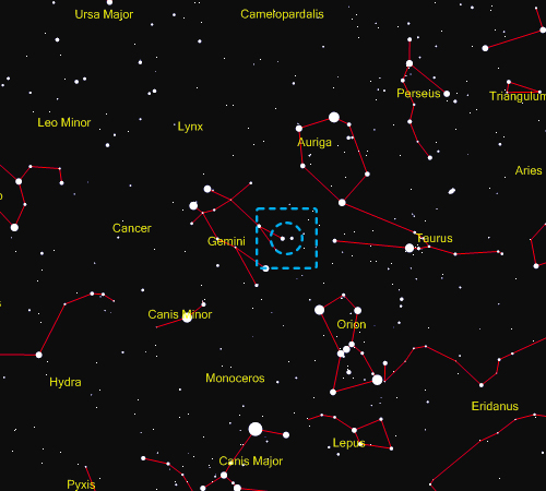 The nebula is positioned between two bright variable red giant stars that represent the feet of Castor, who stands next to his Geminian twin Pollux. To the left is Mu Geminorum (Tejat Posterior, back foot) at a distance of 230 ly, which is both cooler and brighter than the Sun. To the right is Eta Geminorum (Propus, front foot), a triple star at a distance of 350 ly. The primary is a spectroscopic binary with a period of about 8 years. The secondary is a dwarf star with an orbital period of about 700 years. These stars are much nearer and appear about 4000 times brighter than the nebula.
