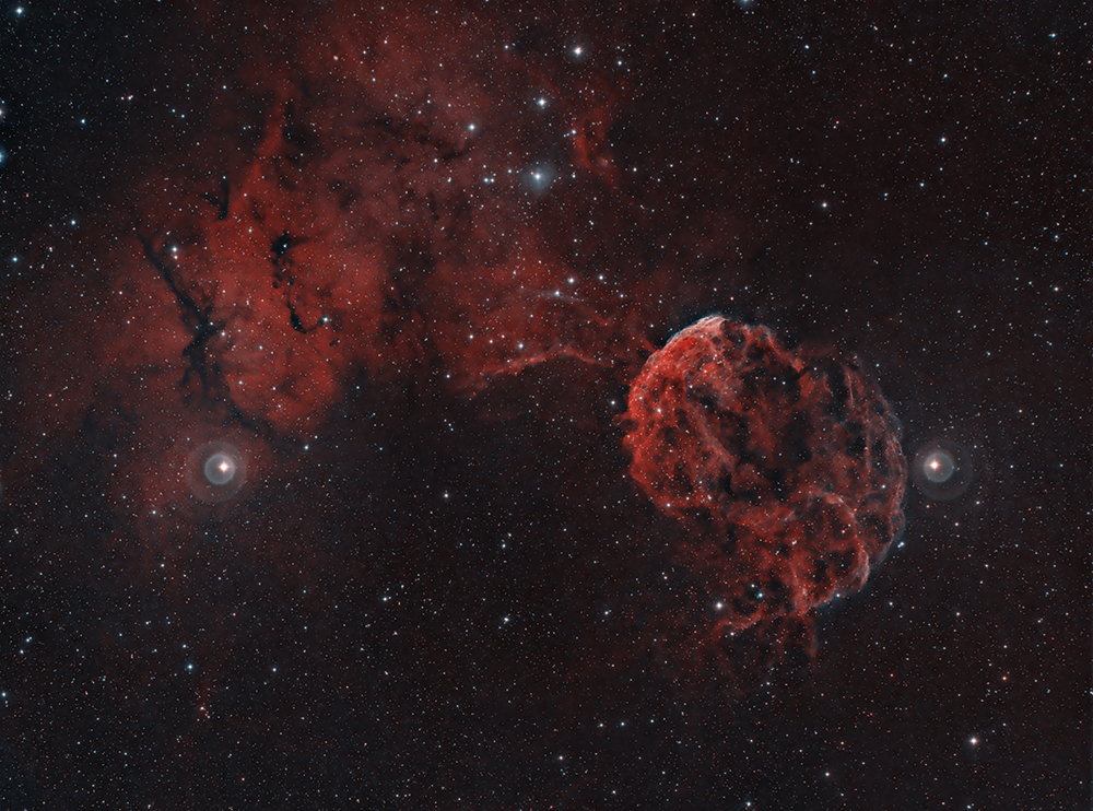 This extreme brightness created significant problems during processing. It was necessary to continually mask the two bright stars so that the relatively faint surrounding nebulosity could be developed without overexposing the area of the stars.