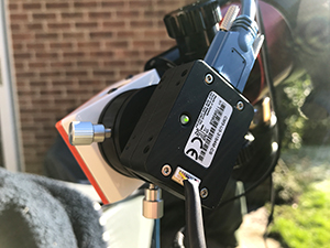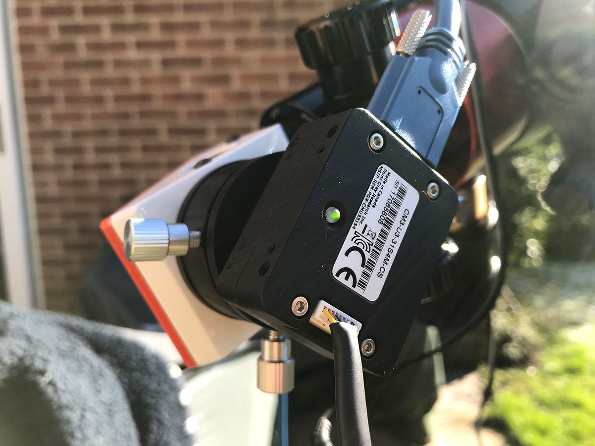 My most recent camera purchase, the USB3 high frame rate Chameleon 3. It is based on the Sony IMX265 CMOS mono chip, capable of 55 frames per second at 2048 x 1536 3.45μm pixels. It's only a small unit, but performs fantastically well with the Lunt solar scope and gives me the quality of solar images that I have been aiming for. (ptgrey.com)
