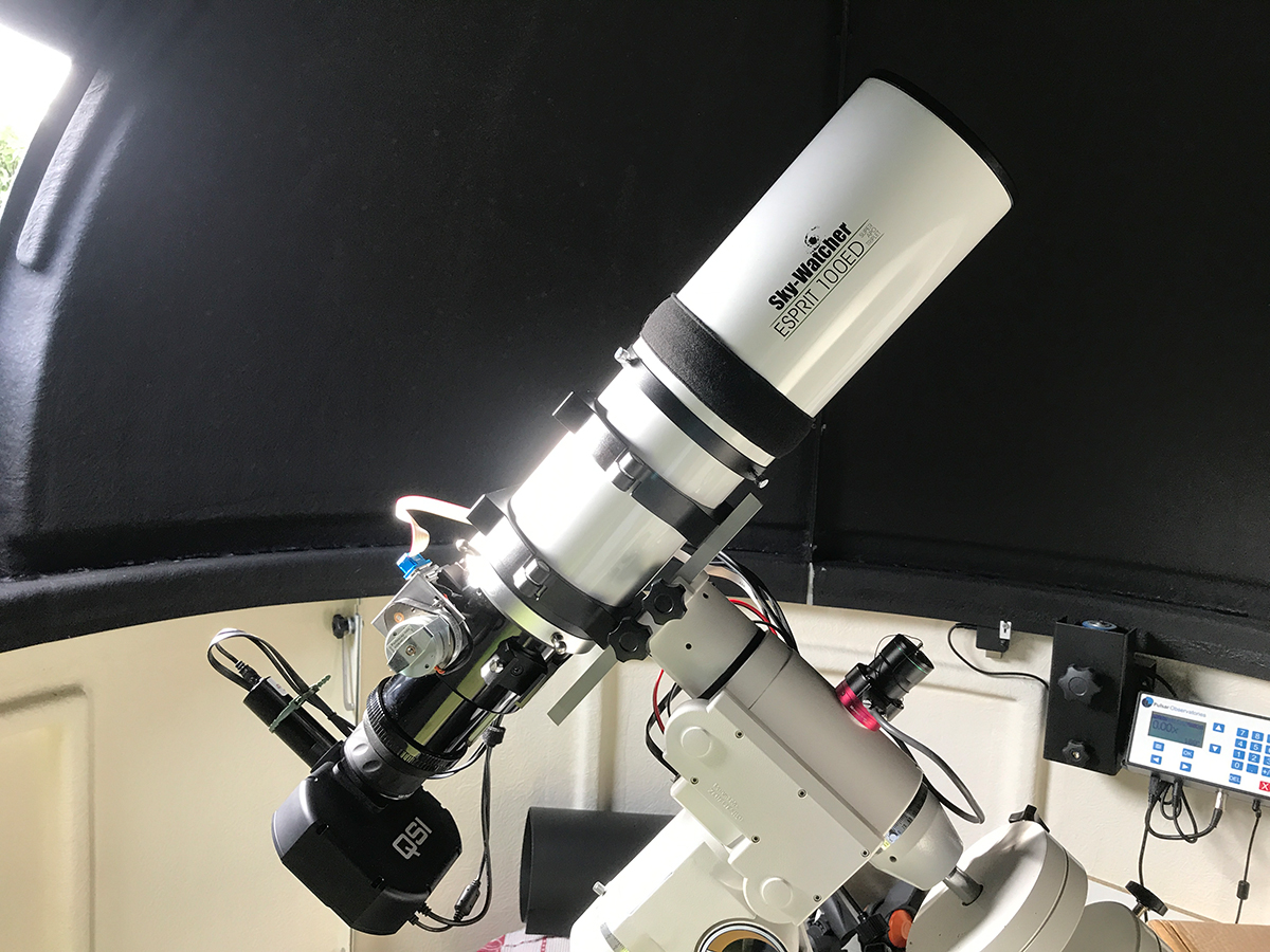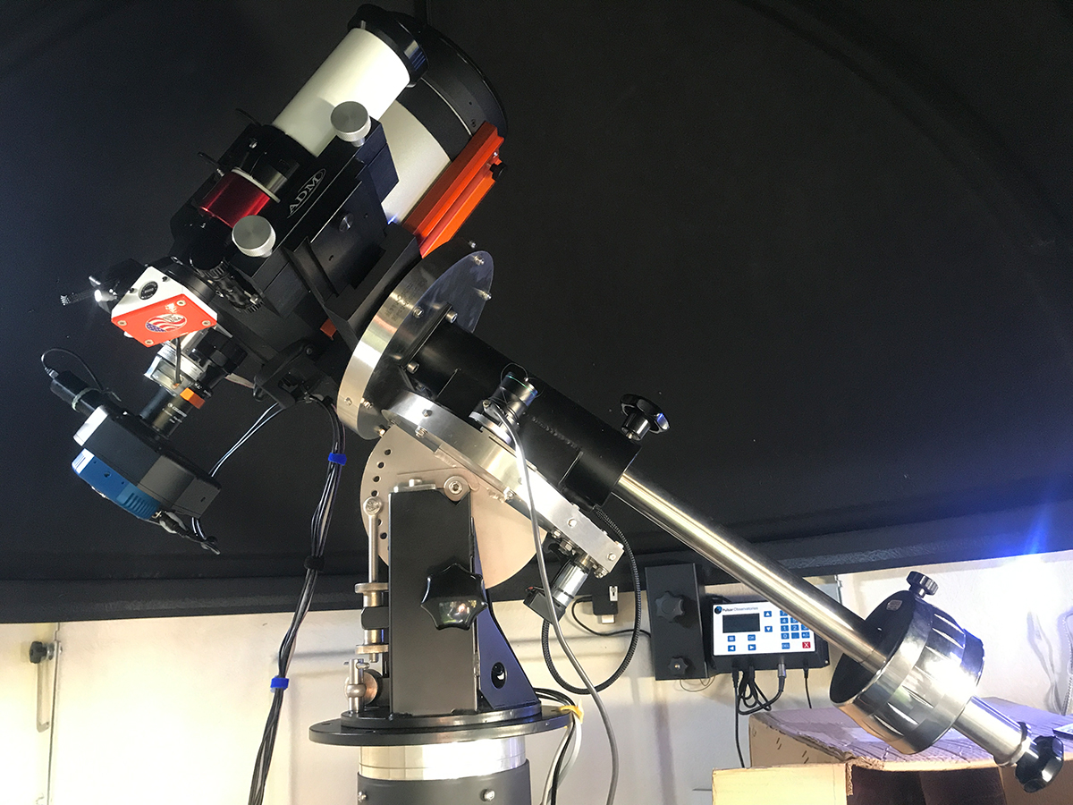 The Mesu 200 is a recent upgrade to the RPO system, made in November 2018. After much research a couple of years ago I decided that the ultimate mount for what I am doing would be the Mesu 200. When one came up for sale second-hand on UK Astro Buy & Sell, I just couldn't resist. It is a spectacular piece of engineering and is a huge step up from the HEQ5. The tracking performance of the Mesu is outstanding and the load capacity is insane! It can carry up to 75kg of kit, huge compared with the 11kg limit of the HEQ5. I am using a side-by-side mount bar so that I can simultaneously mount my Lunt solar scope, always ready for solar action. This upgrade is rapidly moving me towards a situation where the limiting factor to the quality of my images is no longer equipment, but sky quality. There's not a whole lot I can do about that in Wiltshire! (mesu.nl)