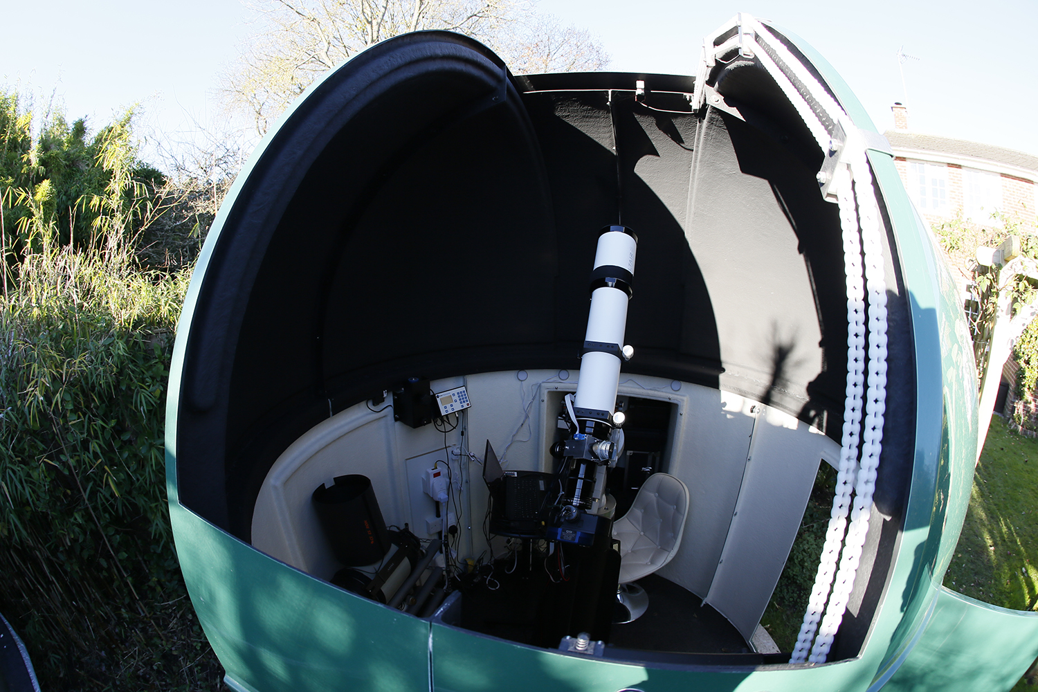The perfect home for all my astro gear - a 2.2m green Pulsar dome. The plan was to create a remote operable observatory that I could control from anywhere that has internet access. It has not been a totally smooth journey, but I now have what I set out to achieve. I have even been known to start up and monitor an imaging session from the dining table when invited round to friends on a clear dark night!