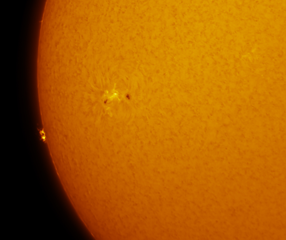 Close up view of AR2699, a new sunspot region, and the prominence on the lower oncoming limb. Unfortunately poor seeing has made this image rather unclear.