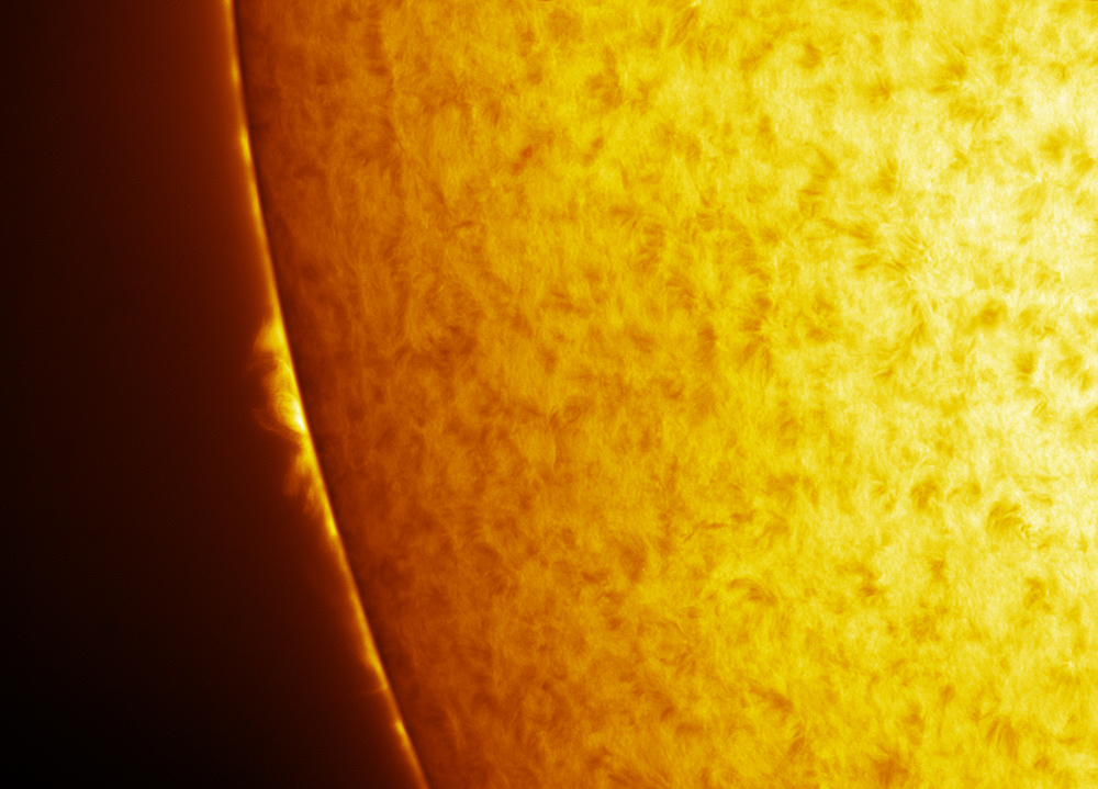 This is the first time that I have used the fabulous old Thomas Cooke 10" refractor housed in the Marlborough College Blackett Observatory, for solar imaging. Combined with the Daystar University hydrogen alpha filter, it makes for a very efficient system. This image is constructed of two images - one for the surface detail and one for the prominence detail, the two combined in Photoshop. I am extremely happy with the results obtained from the 158 year old telescope!