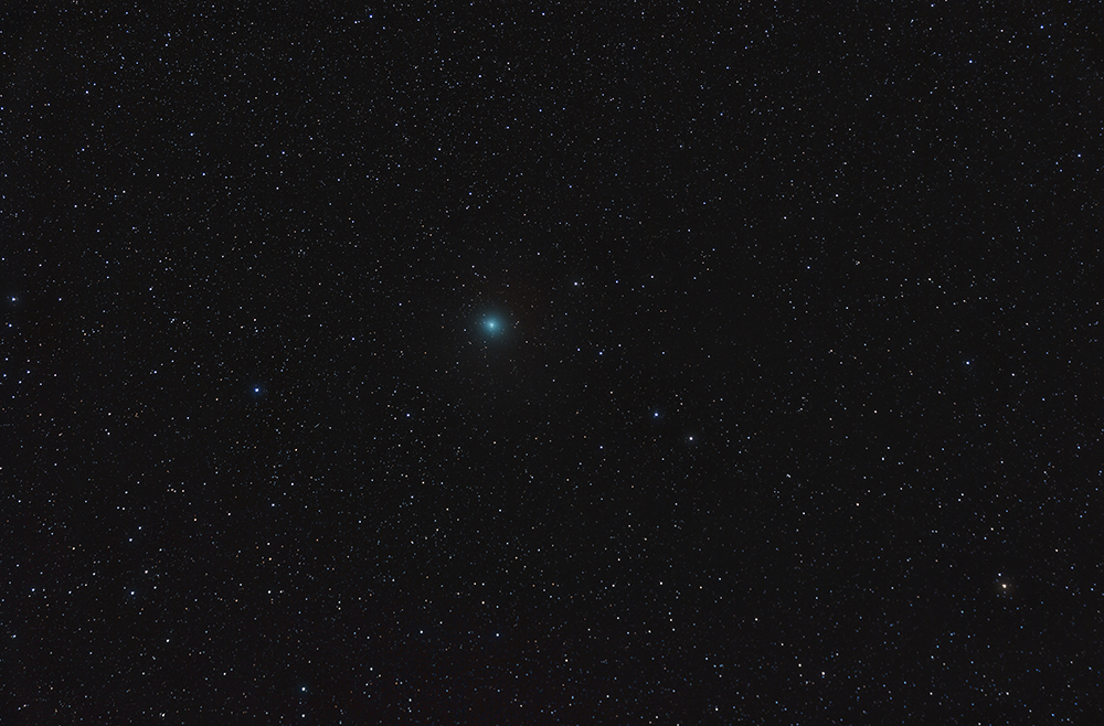 This is a wide field view of comet 46P/Wirtanen. I set up my DSLR with a 70-200mm lens at 85mm on my Skywatcher Star Adventurer mount and let it click away taking 60s captures for as long as possible while I watched the Geminid meteor shower. The meteors were beautiful and plentiful and the 102 minutes of data has created a nice portrait of the flourescent green comet.