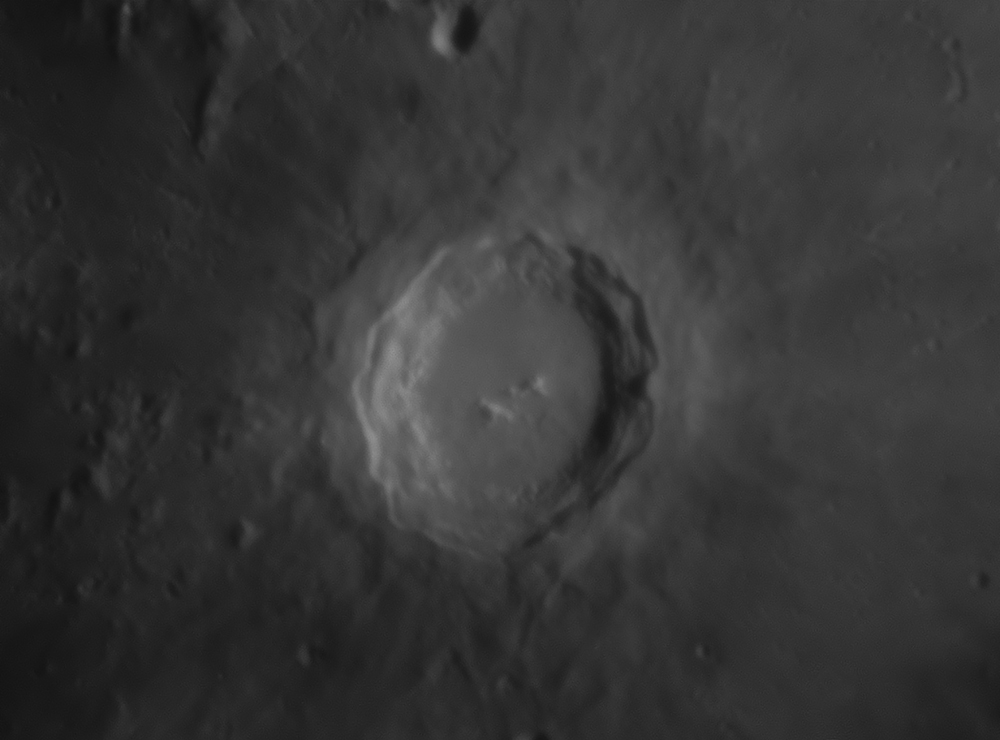 An extreme close up of the crater Copernicus. I used the 2.5x Powermate for this shot. Really the atmospheric conditions were not stable enough to allow this kind of magnification, but it was an experiment. I will definitely be trying more of these kind of shots when the air is thinner.