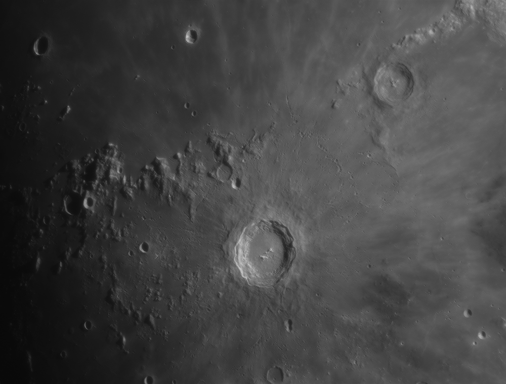 This shot was taken with an 80% Moon, so the crater Copernicus was quite near the terminator, consequently plenty of shadow detail is showing here. Copernicus is about 93km across. Other main features in the image are the crater Eratosthenes in the upper right portion of the image, with Montes Apenninus stretching away into the upper right corner. The mountain range above and to the left of Copernicus is Montes Carpatus.
