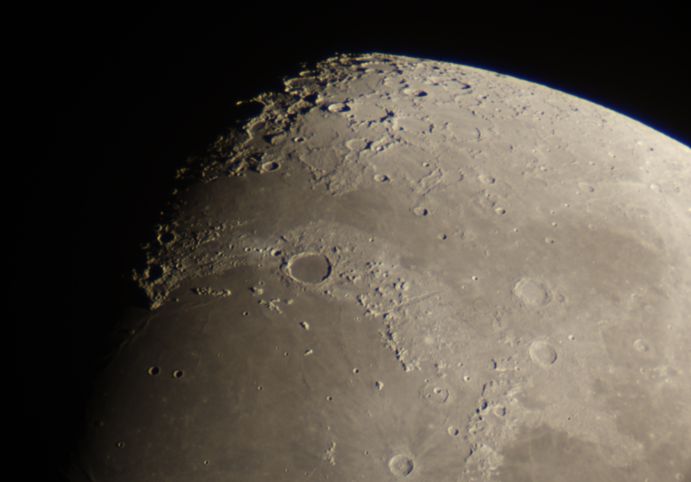 Another image of the crater Plato and its surroundings. There is a slight colour hue to this image compared to previous imaging attempts. I used a Canon DSLR for this image, so it is in full colour. The warmer yellowy colour around the terminator is probably due to chromatic aberration.