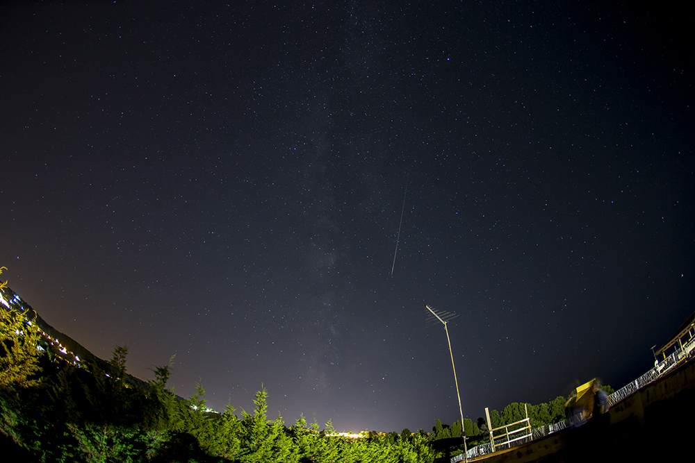 While on holiday in Calabria, Southern Italy, this summer, I spent quite some time imaging from the roof terrace. This is one frame from a time lapse that caught an impressive Perseid meteor streaking towards the Southern horizon.