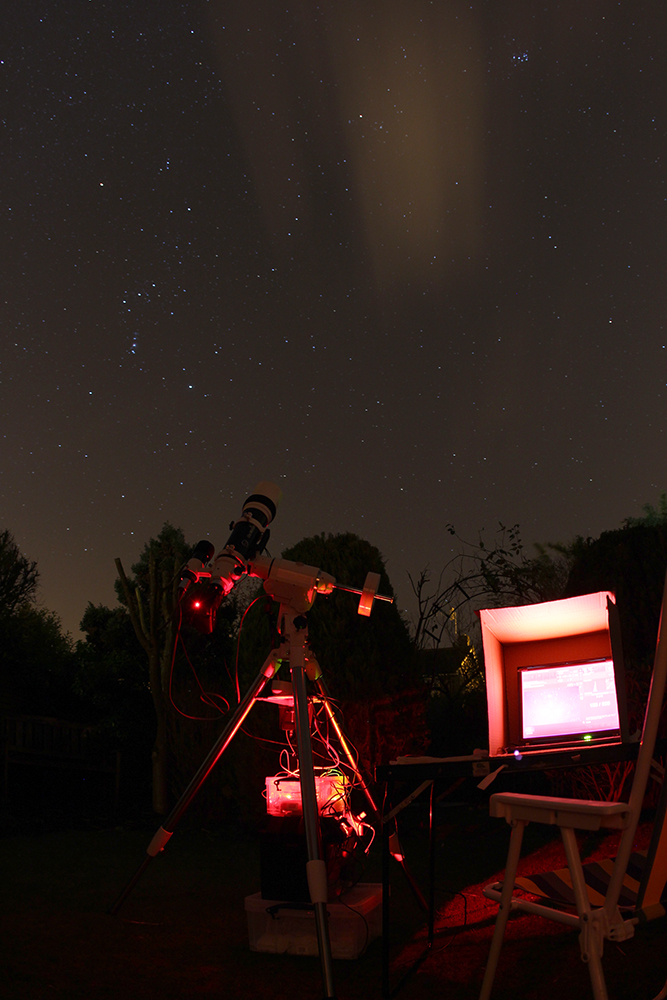 Here is a picture of my original pre-observatory, set up in action in the middle of my garden. It appears to be a tangle of wires and red lights, but it all makes sense to me. Note the cardboard box protecting the laptop from the cold, an essential piece of kit! Unfortunately the smudge across the top of the image is not the Aurora Borealis, but just a passing cloud. Orion, Taurus and The Pleiades are clearly visible in the sky. I used this image as the front cover to my book, 'In The Marlborough Night Garden - Volume 1'.