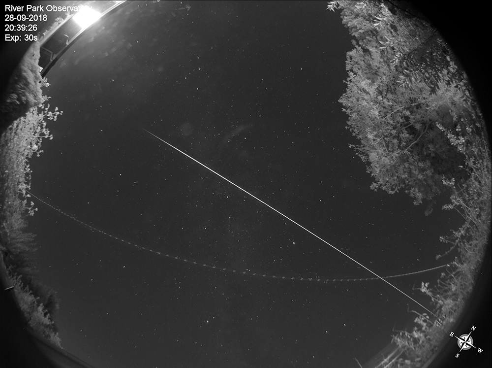 At the same time as I was taking the photo of the ISS pass at the West Kennet Long Barrow, the All Sky camera outside my River Park Observatory was also capturing the night sky. I thought it would be interesting to put together this image showing a different view of the ISS pass and airplane trail.