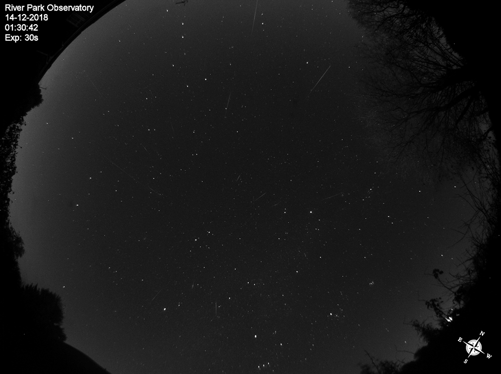 The night of 13th December was the peak of the Geminid meteor shower, a display of shooting stars from the debris left behind by asteroid Phaethon. For once it was a clear night and the all sky camera was running outside the RPO. I constructed this montage from the 16 frames that caught a Geminid meteor. It is clear to see that all the meteors point back to a point of origin, the radiant, somewhere close to Castor in Gemini.